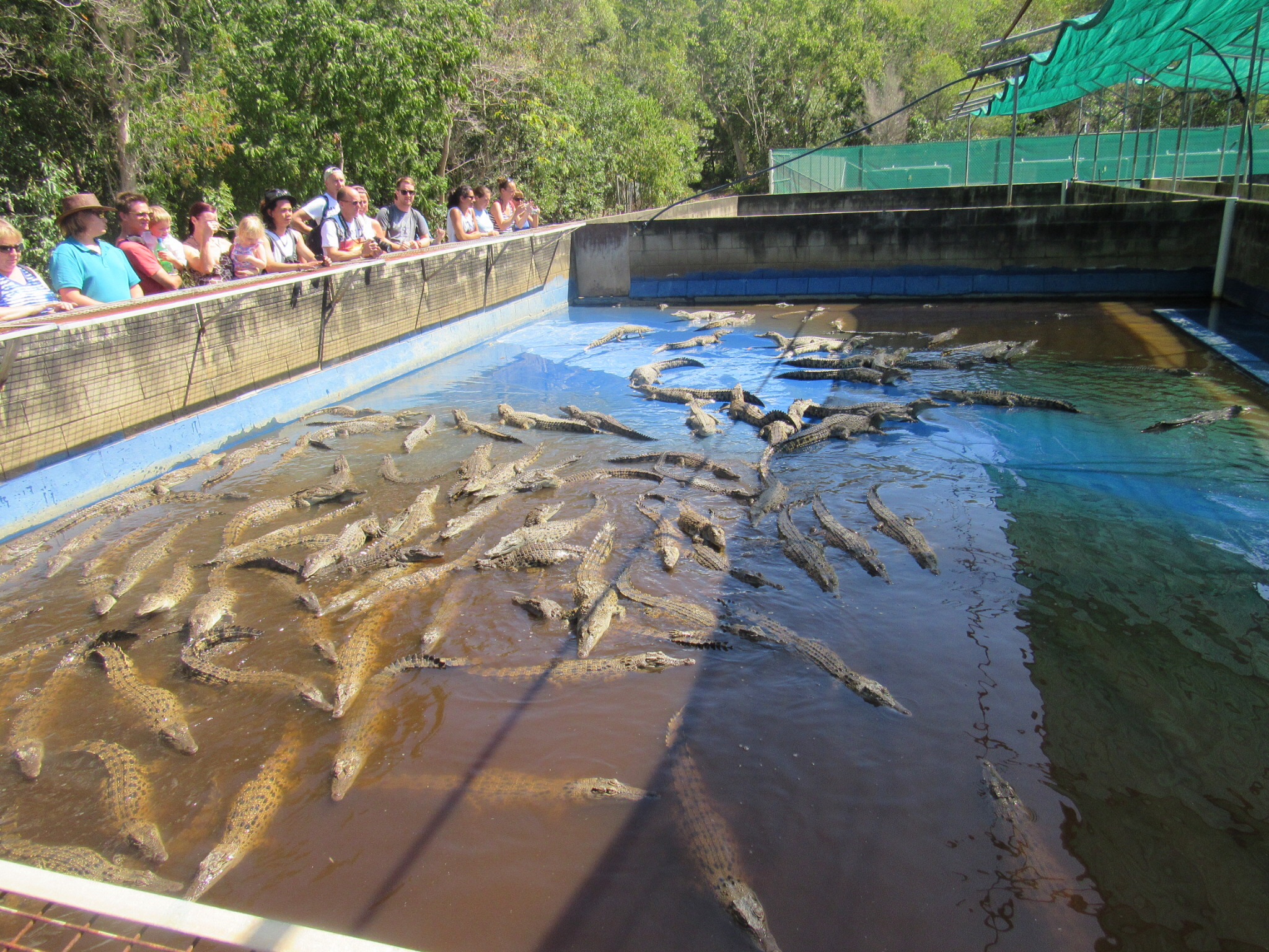 This is what a crocodile farm looks like. These are hundreds of 2 year old males. They will be ready for “harvesting” in another year! Presumably male, as the sex is determined by the temperature at incubation. They are farmed for their skin and meat.